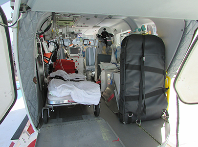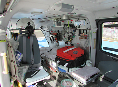 ヘリコプターの内部には、心電図モニター、医療用徐細動機、エコー、医療用酸素等が搭載され、患者さんをストレッチャー(担架)に載せた状態で搬送することが可能です。運航は、飛行経験豊富な民間運航会社により運航されています。