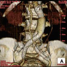 血管造影・X線透視装置を中心に、超音波断層装置や世界初となるMRXO(MRI、血管造影、手術室一体型)システムを駆使した画像下での、カテーテルや高周波、レーザーなどを使用した血管内治療や気管、胆道の治療が中心となります。具体的には、原発性肝癌(消化器内科と共同)を中心とした癌への化学塞栓療法、転移性肝癌や子宮癌などへの動注化学療法のためのリザーバーシステム埋め込み(一般外科と共同)、閉塞性動脈硬化症や腎血管性高血圧、透析シャントなどに対する血管形成術(心臓血管外科や腎センターと共同)や大動脈瘤に対するステントグラフト治療(写真)、胃静脈癌に対する硬化療法、門脈圧亢進症による静脈瘤・肝性脳症に対する塞栓術や胆道ステント(消化器内科と共同)、喀血に対する塞栓術や気管・気管支ステント(呼吸器内科と共同)、外傷(肝、脾、腎、骨盤骨折、腸間膜損傷など)に対する塞栓術(高度救命救急センターと共同)、などが主な治療となります。
