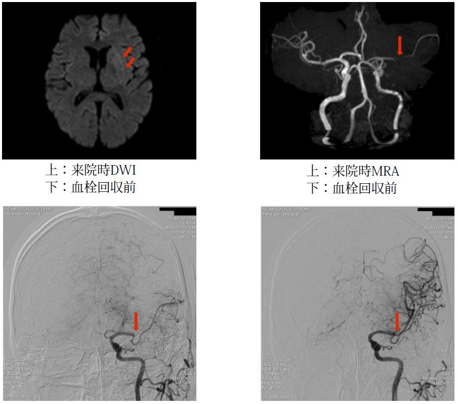 写真:急性期脳梗塞患者さんの具体的事例を示す。右半身の完全片麻痺で発症し、発症から33分で当院に搬送された。来院時頭部MRI 拡散強調画像(DWI)では左基底核に高信号を認め、magnetic resonance angiography(MRA)では、一側の中大脳動脈が閉塞していた。来院後45分で血栓溶解療法を行い、78分で血管内治療を行い、発症から138分で完全再開通が得られた。入院後心房細動が検出され、心房細動による心原性脳塞栓症と診断し、新規抗凝固薬を導入し、2週間後独歩にて自宅退院した。以上のごとく、本例では血栓溶解療法、血管内治療による急性期治療の有効性が示された。