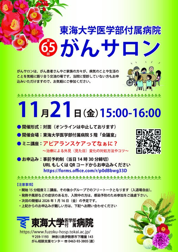日時:11月21日(金)15:00-16:00会場:当院5階「会議室」ミニ講座:アピアランスケアってなぁに?~治療による外見(見た目)変化の対処方法やコツ~お申込み:事前予約制(当日14:30締切)。こちらからお申し込みください。